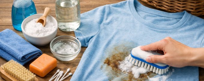 Za svetle stvari iz gostega bombaža lahko uporabite mešanico sode bikarbone in vodikovega peroksida. Ta mešanica ne le odstrani maščobo, temveč ima tudi rahel belilni učinek, ki tkanini povrne prvotni videz. Pri delu z barvnimi ali tankimi tkaninami velja učinek katerega koli izdelka predhodno preveriti na neopaznem delu šiva.